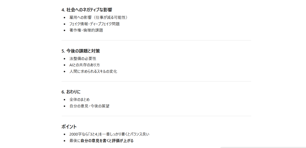 そこで一番賢い使い方が、「構成案の作成」と「アイデア出し」だけを任せることです。 例えば、「『生成AIが社会に与える影響』というテーマで2000字のレポートを書くから、目次を考えて」と指示します。これだけで、一瞬で論理的な骨組みが完成します。この2つをAIに先にやらせておくだけで、その後の執筆スピードがめちゃくちゃ変わります!