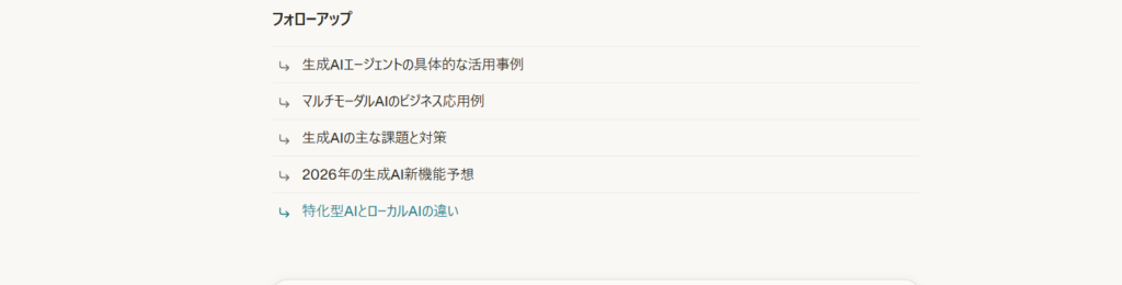 ChatGPTは過去のデータを元に文章を作るのに対し、Perplexityは「リアルタイムのネット情報」を検索してくれます。「生成AIの最新トレンドを教えて」と聞くと、分かりやすい解説と一緒に**「根拠となるサイトのリンク」に番号を振って教えてくれるんです。いちいちGoogleで検索して使えそうな論文や記事を探す手間が省けるので、リサーチ時間が半分以下になります。